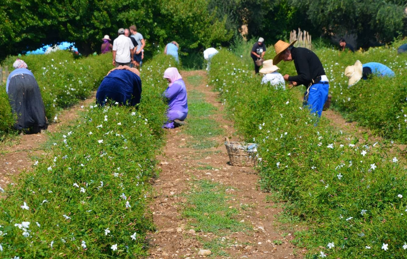 Jaśminowe kwiatki są nie tylko drobne, lecz także bardzo delikatne. Zbiera się je nad ranem, zanim zaczną się rozwijać i zanim słońce wyssie z nich wilgoć i eteryczne olejki. Każdy kwiat zebrać trzeba ręcznie: ostrożnie, uważając, by nie pognieść delikatnych płatków.